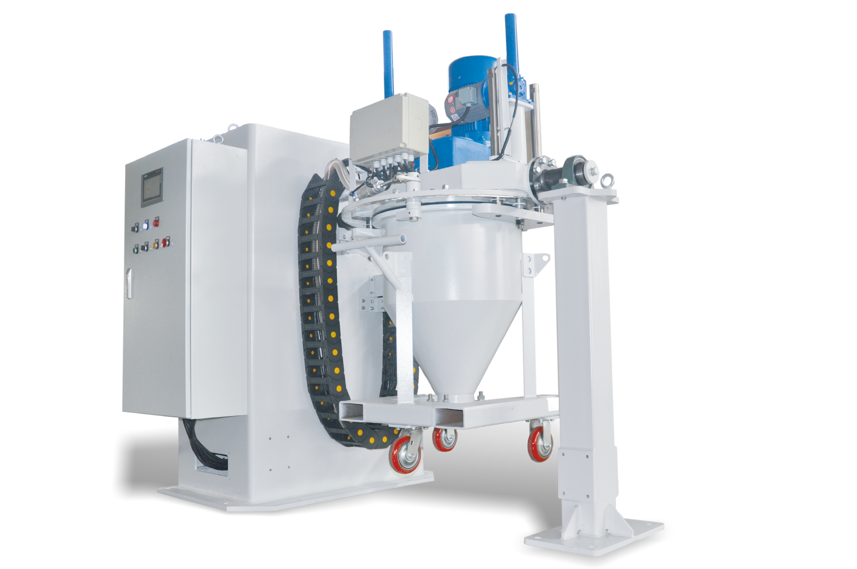 FHJ系列翻轉式自動混合機FHJ系列混合機采用可移動式料斗,適用于各種粉末及粒狀材料的混合攪拌。裝有待混合原料的料斗推到工位后,自動控制系統將其提升,與攪拌頭安全鎖定。料斗與攪拌頭一起翻轉180度