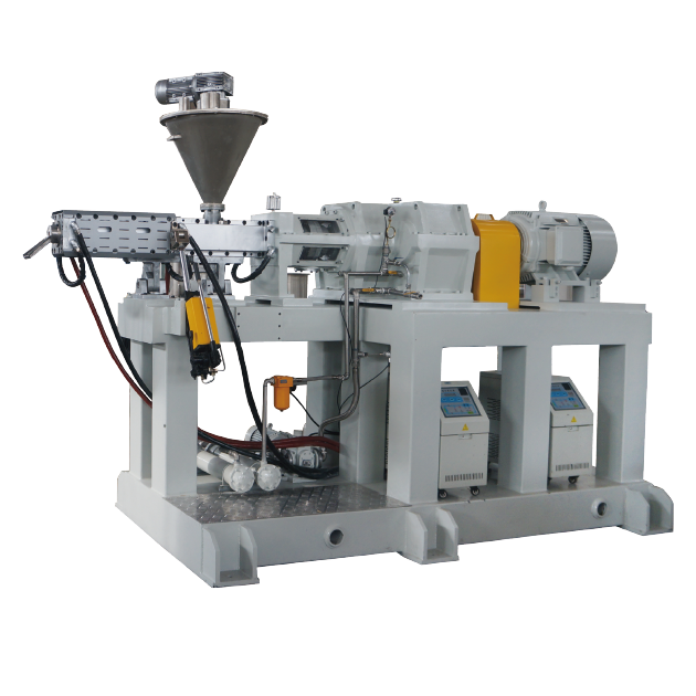 SLJ-M 系列雙螺桿擠出機該系列擠出機為雙螺桿同向旋轉結構。在安裝于雙螺桿上的螺旋塊和混煉塊相互精密嚙合作用下,將多組分原料充分熱融,達到好的分散及混煉效果。